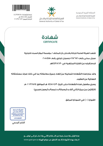 Ar-Rawabi, Al-Khobar, Dammam Saudi Arabia Street Name: Qais Bin Al Hosain Street Road Name: King Faisal Bin Abdulaziz Road P.O Box: 34421 Office: 7B Ist Floor Al-Fanar Offices